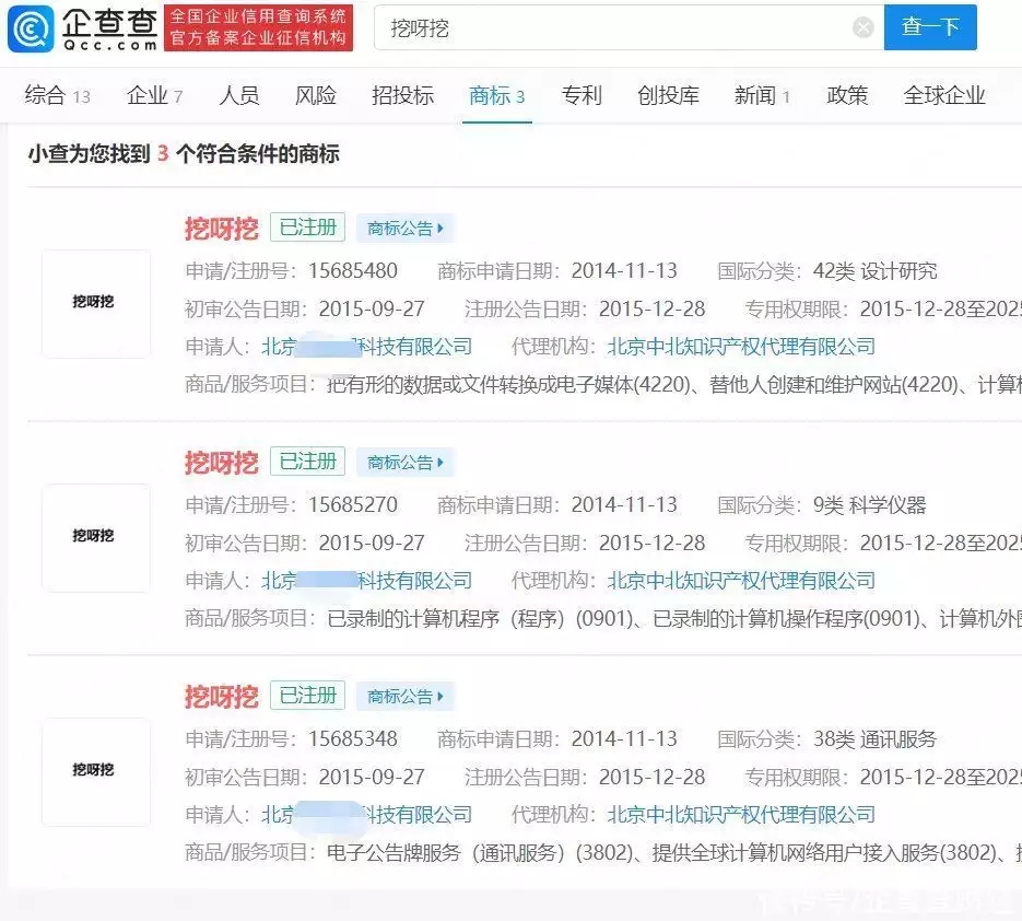 企查查APP顯示,“挖呀挖”已經(jīng)被北京某科技公司申請注冊成商標(biāo),國際分類為設(shè)計(jì)研究、科學(xué)儀器、通訊服務(wù),3枚商標(biāo)狀態(tài)均為“已注冊”。